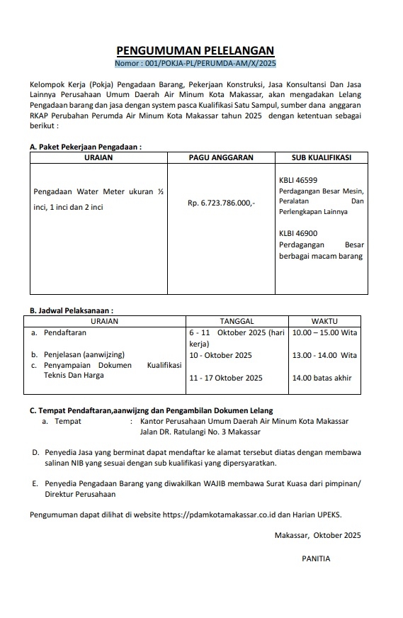 PENGUMUMAN PELELANGAN Nomor : 001/POKJA-PL/PERUMDA-AM/X/2025