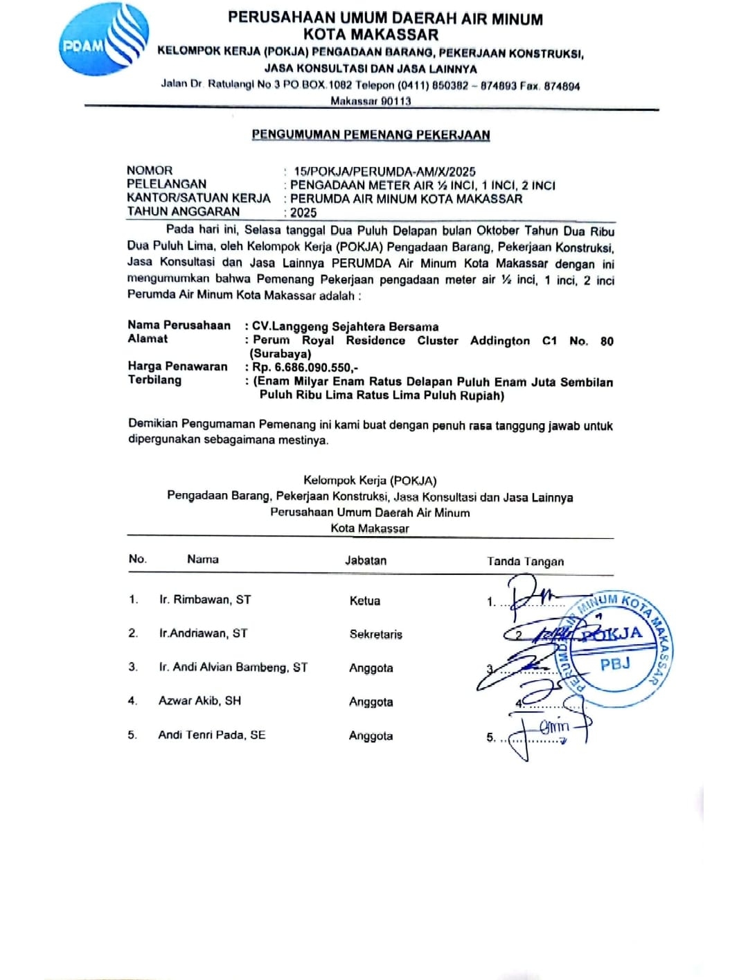PENGUMUMAN PEMENANG PELELANGAN Nomor : 001/POKJA-PL/PERUMDA-AM/X/2025
