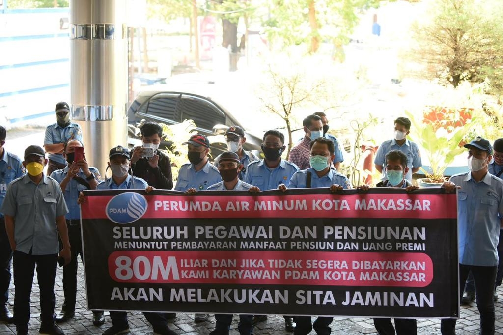 MAKASSAR -- Puluhan karyawan Perusahaan Umum Daerah (Perumda) Air Minum Kota Makassar menggelar aksi unjuk rasa di Kantor AJB Bumi Putera 1912 Jalan Ratulangi, Jumat (30/4). Mereka menuntut perusahaan asuransi tersebut membayarkan hak-hak karyawan dan pensiunan Perumda Air Minum yang belum menerima